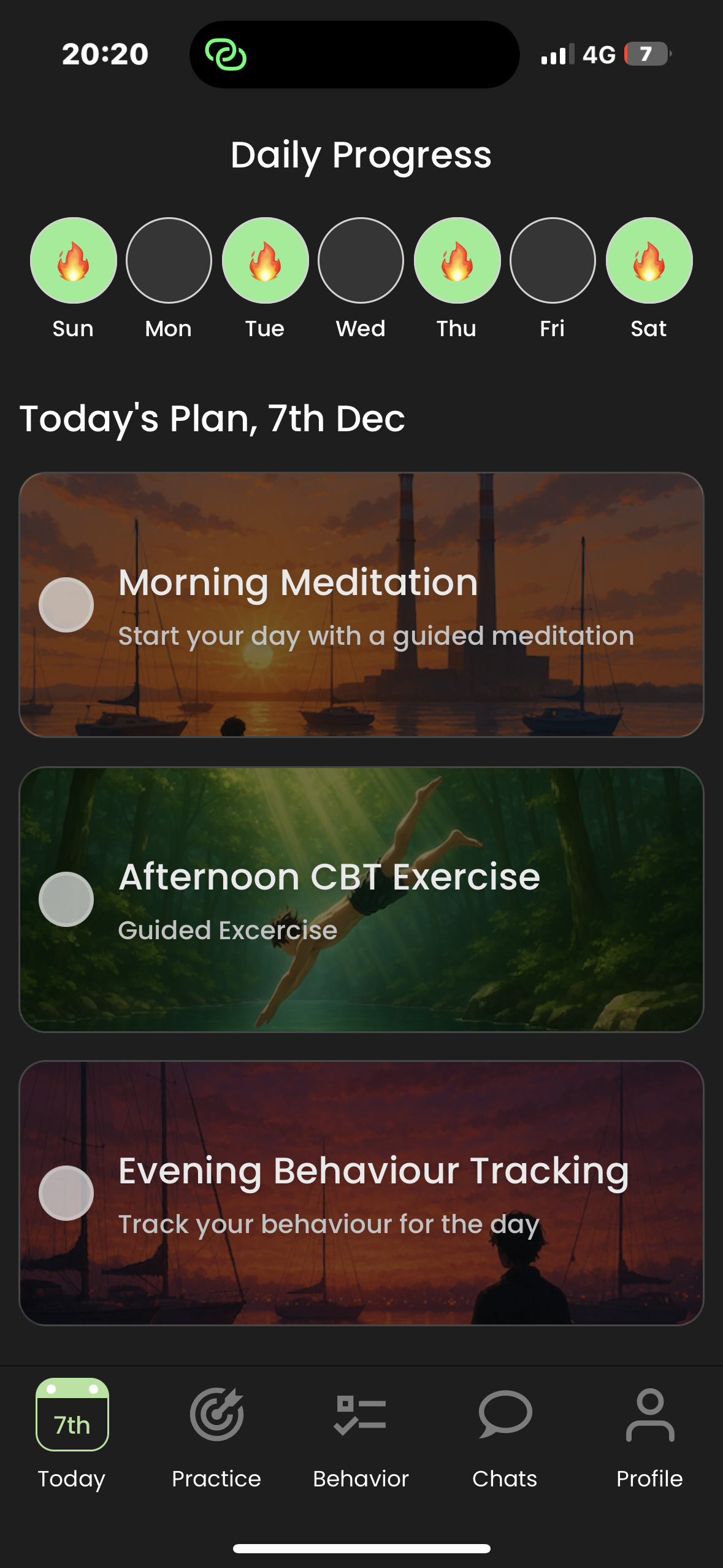 Meditation keeps your mind calm and grounded, even when life gets busy or stressful. CBT exercises guide you to think with clarity and perspective—so you can better understand your thoughts and emotions. Behaviour tracking helps you recognize your wins and your setbacks for the day, so you can improve and grow tomorrow. By practicing these pillars daily, you'll retrain your mind to make calm, focused progress towards your goals.